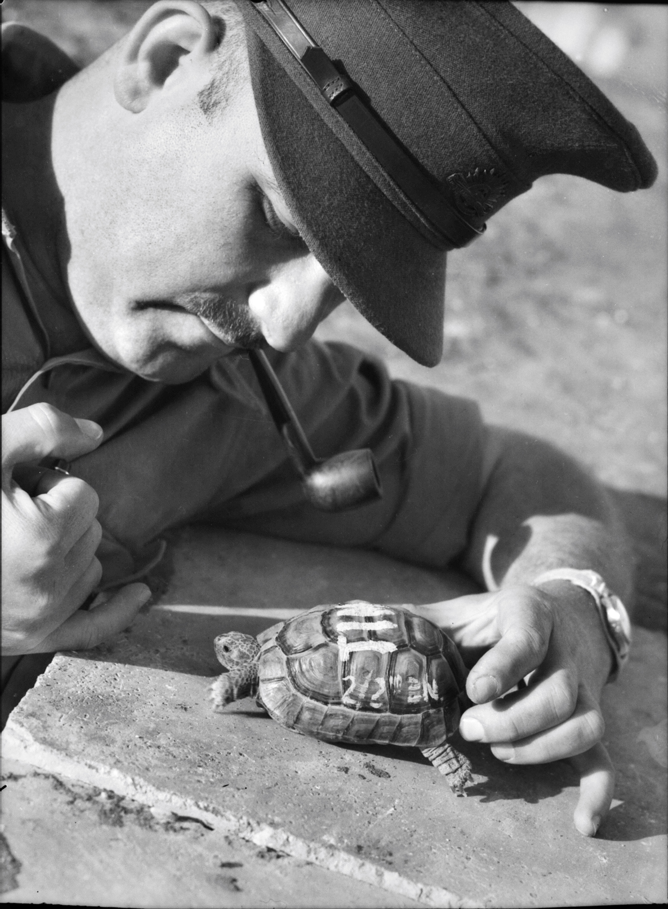 Captain D. Michelson with a Tortoise named "Tim", the mascot of the 2/2nd Battalion.