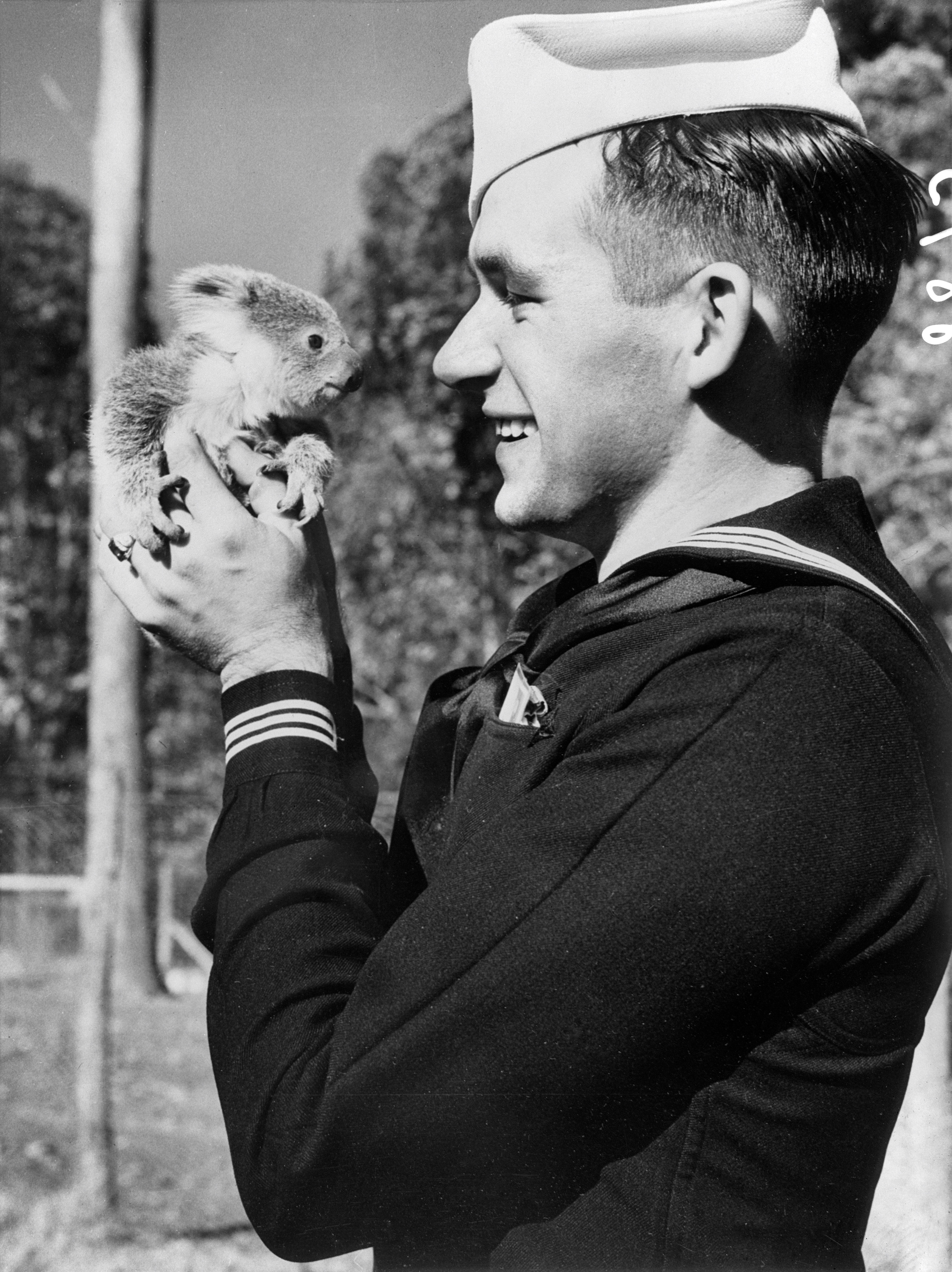 Men of the USS Northampton and USS Salt Lake City were welcomed as friends by all sections of the community when their ships visited Brisbane. Arthur Mercer, from the USS Salt Lake City, was among the party of men who visited an animal sanctuary near Brisbane. He made the acquaintance of Rata, a baby koala.