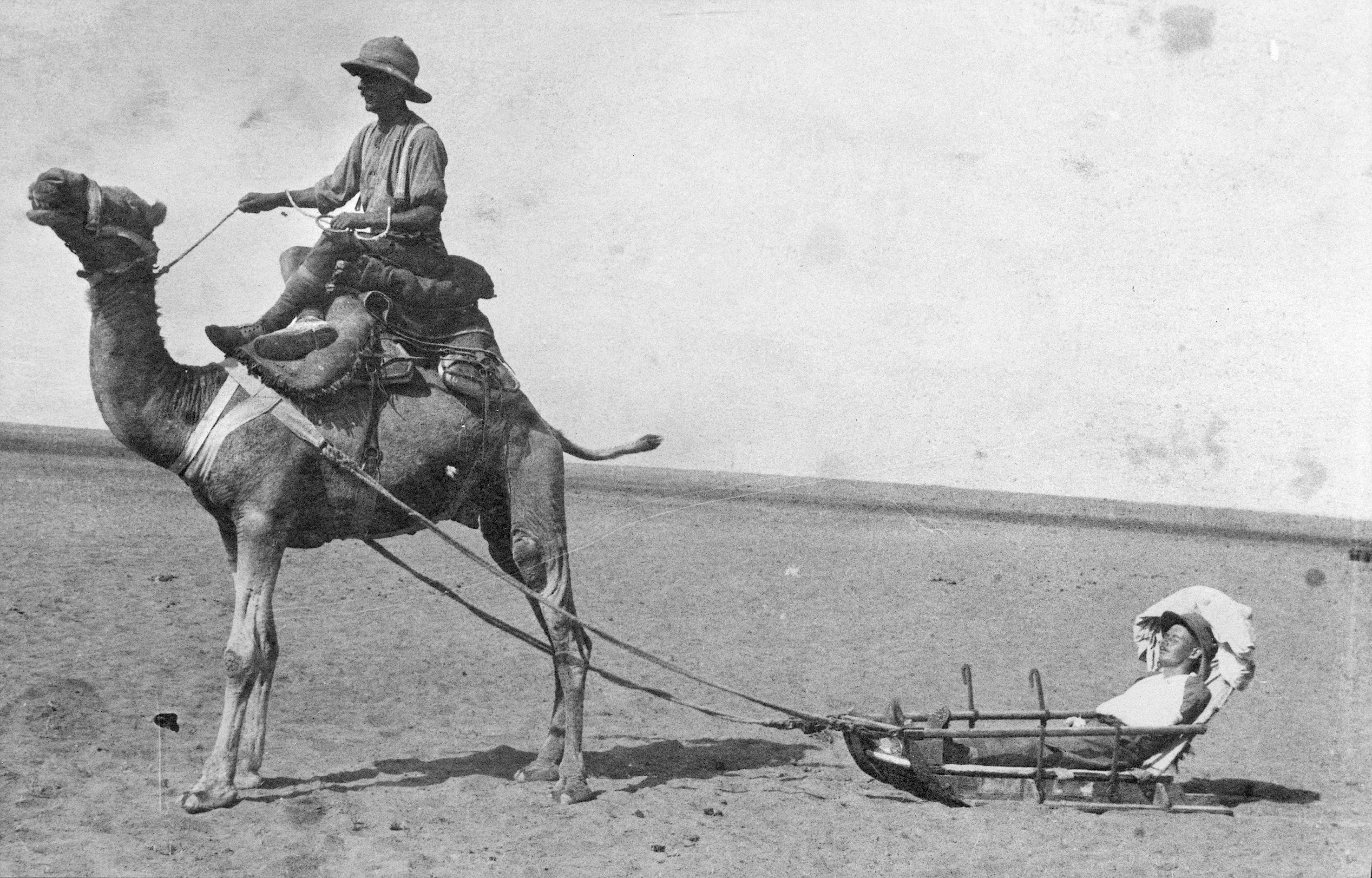 A cacolet fitted with sand runners and harnessed to a camel for transport of casualties in desert areas.