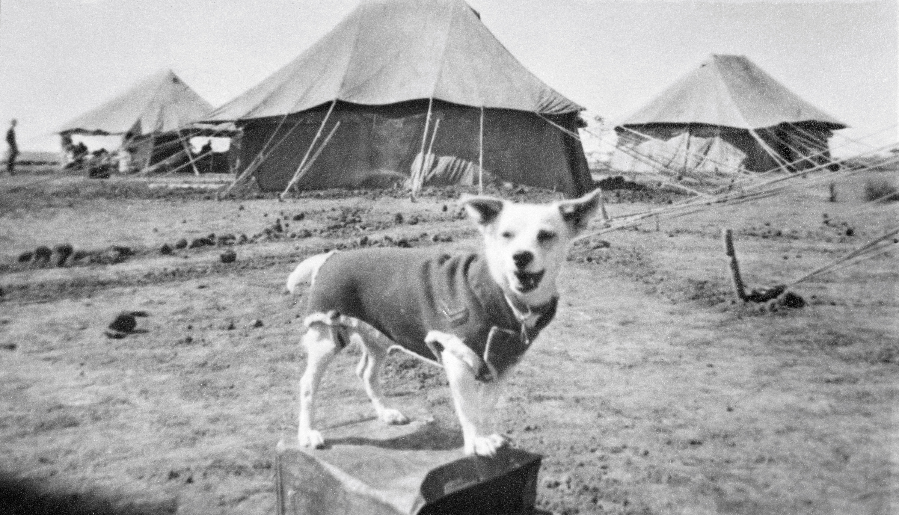 Horrie the Wog Dog, the four-legged mascot and campaigner attached to the 2/1st Machine Gun Battalion, seen here standing on a fuel can wearing his Corporal's uniform. 'Horrie the Wog Dog' was a white Egyptian terrier cross puppy who was found in the Ikingi Mariut area of the Western Desert by VX13091 Private (Pte) James (Jim) Bell Moody, a despatch rider with 2/1 Machine Gun Battalion.