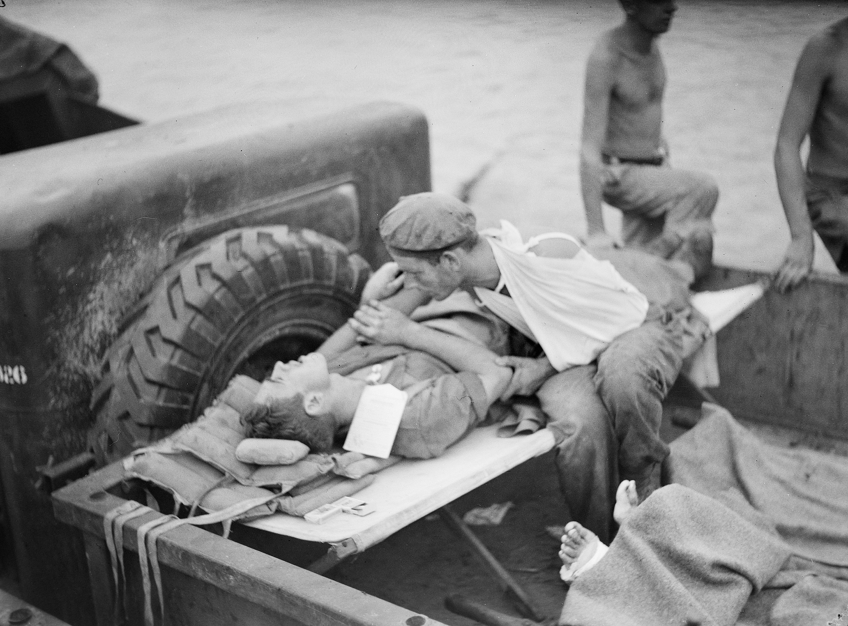 A wounded soldier calms a shellshocked comrade. New Britain, March 1945.