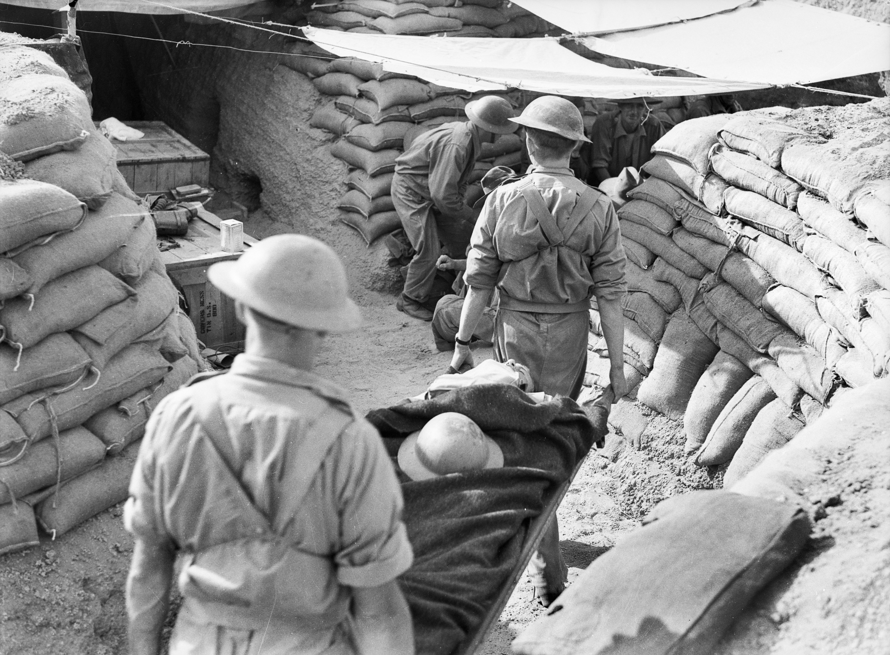 The tanks (British Matildas) came up and the first one faltered and had to go back and fill [the ditch] and then crashed over. This was the most dramatic moment and, oh boy, what a relief! I got my stretcher-bearers to break the Geneva Convention Rules and help the engineers to fill the ditch to let the tanks get in. When the second one went over my stretcher-bearers followed me out of the ditch and through the wire without faltering.