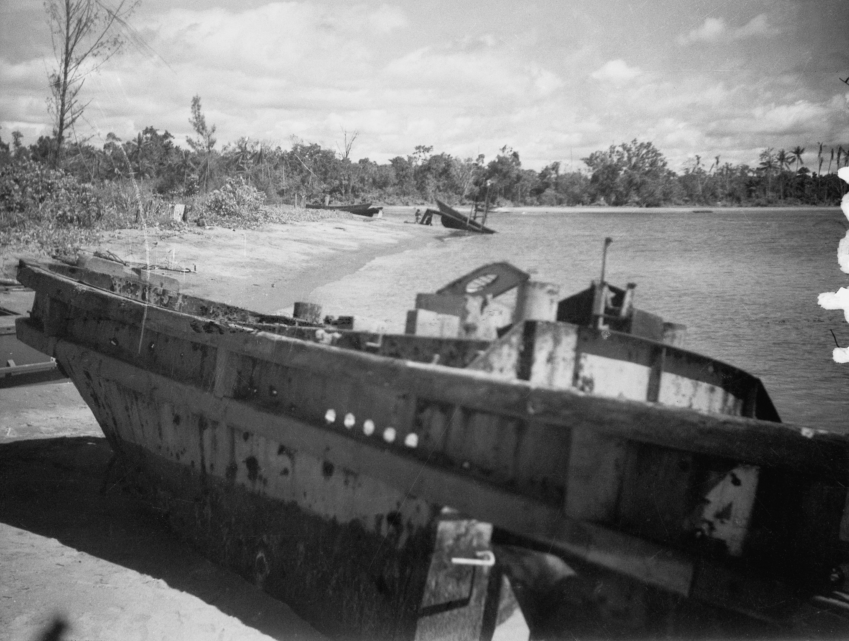 Open barges were used to transport casualties up the Papuan coast towards Lae. Many, such as these wrecks on Sanananda beach, were destroyed by Allied aircraft. AWM 079651