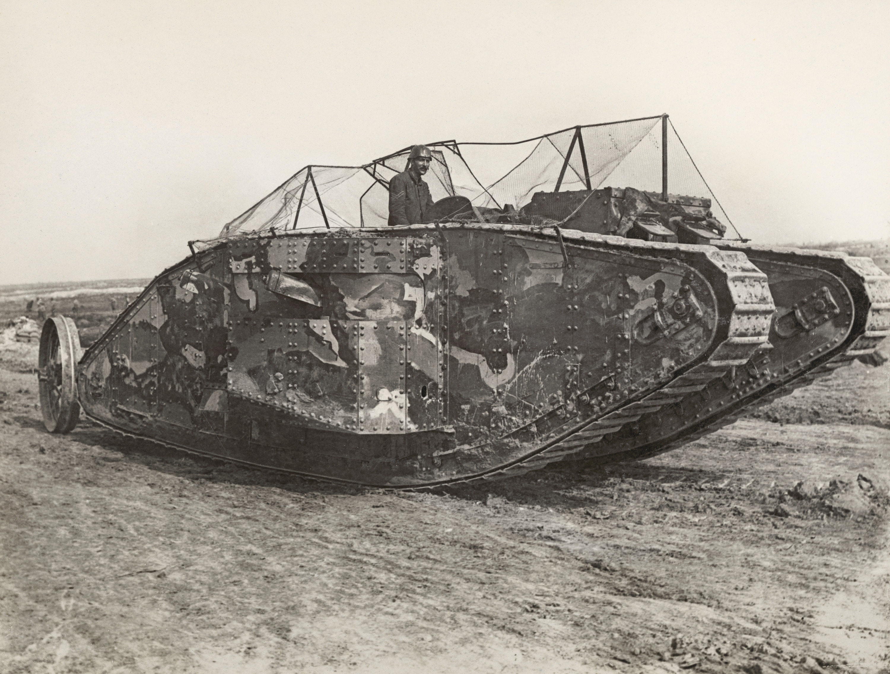 A British Mark I female tank, 1916. Female tanks were not equipped with the two 6-pound guns found on male tanks. The netting over the crew member is designed to shed grenades.