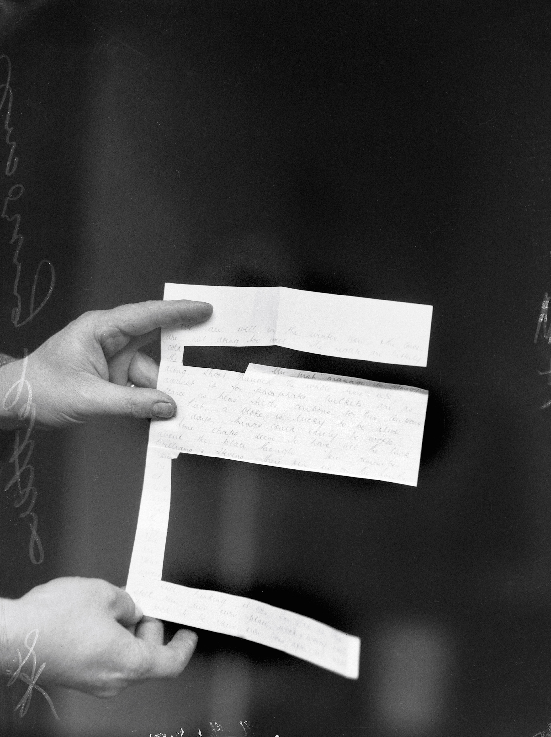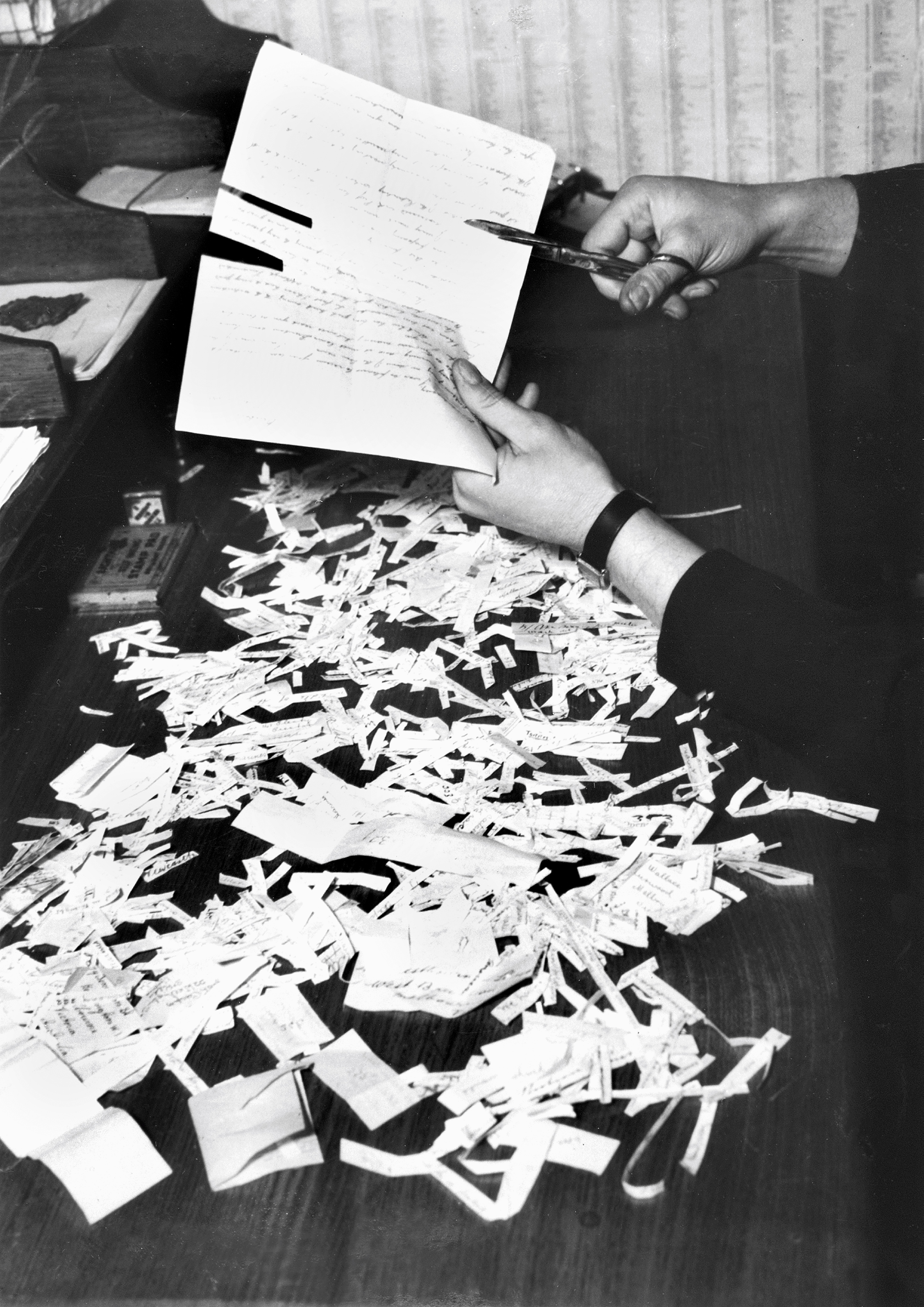 Mail censor cutting “indiscreet” material from a letter, Melbourne, 1943. Photographer: Melbourne Herald.