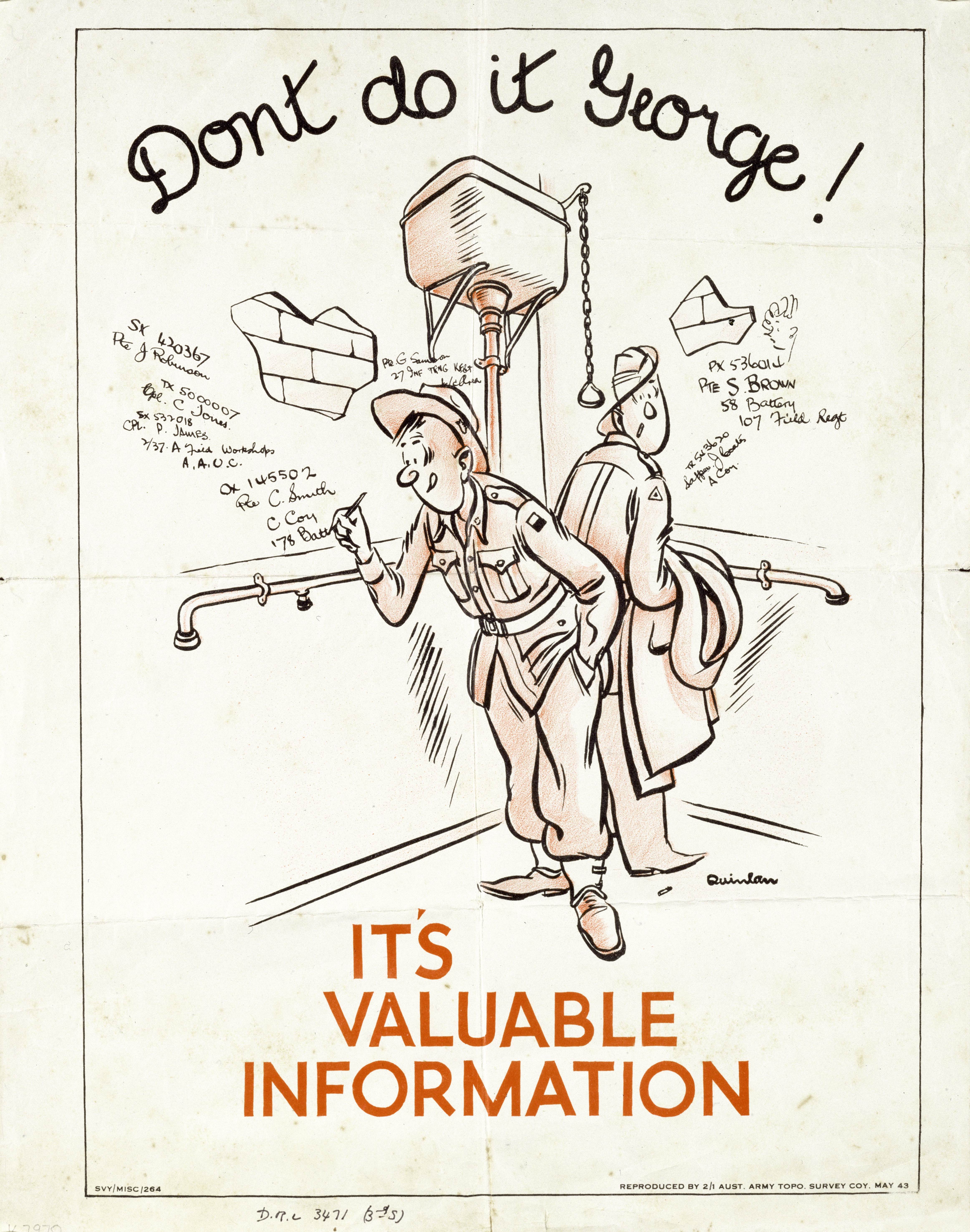 Hal Quinlan, Don’t Do It George, It’s Valuable Information (1943, photolithograph, 43 x 34 cm). A soldier writing his name, number, and unit on a toilet wall.