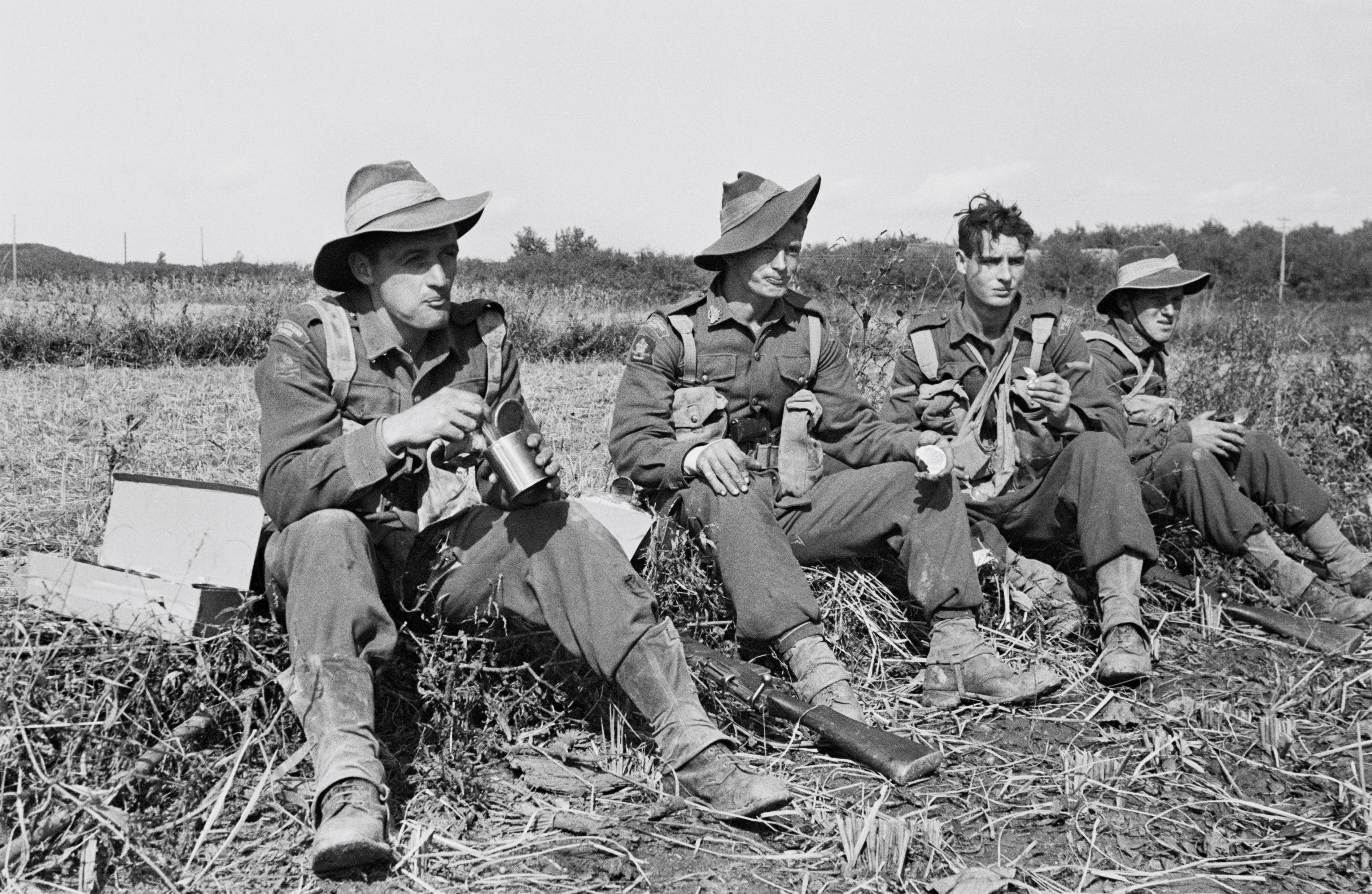 Sergeant Jack Harris (left) takes a break after 3RAR's first battle at the Apple Orchard near Yongju, North Korea. 22 October 1950. Photographer: Phillip Hobson