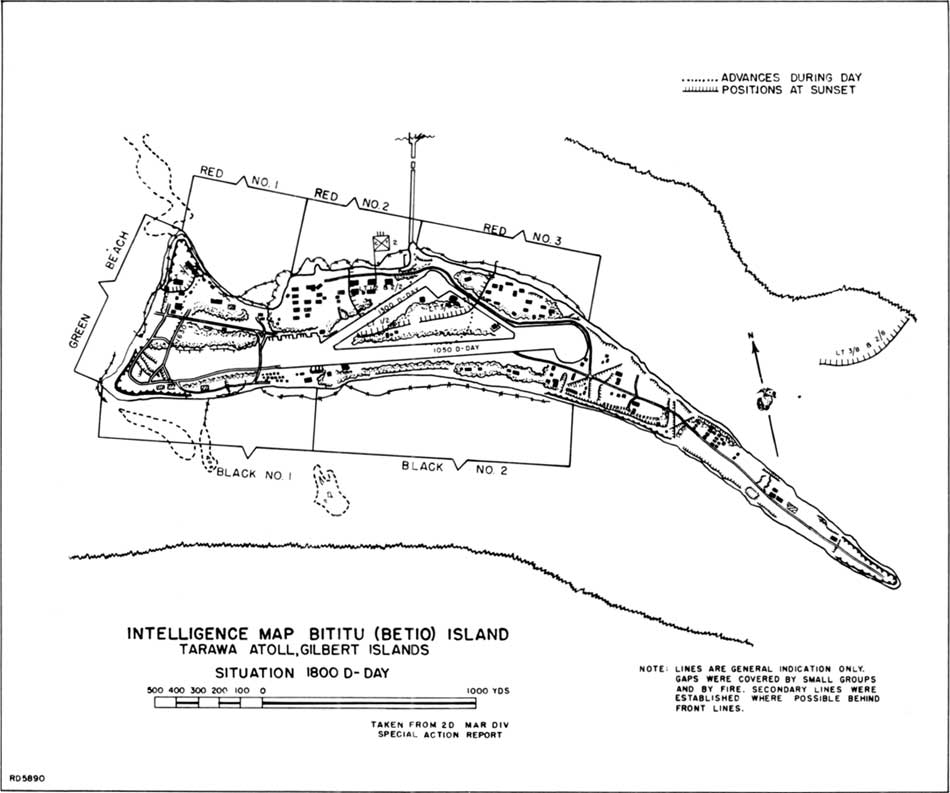 Marines who made it ashore were pinned down by heavy fire. By noon, though, they had secured Red Beach 2 and captured the first line of defences. By the first evening, thousands of Marines had reached the shore, but hundreds lay dead on the beaches and in the lagoon.