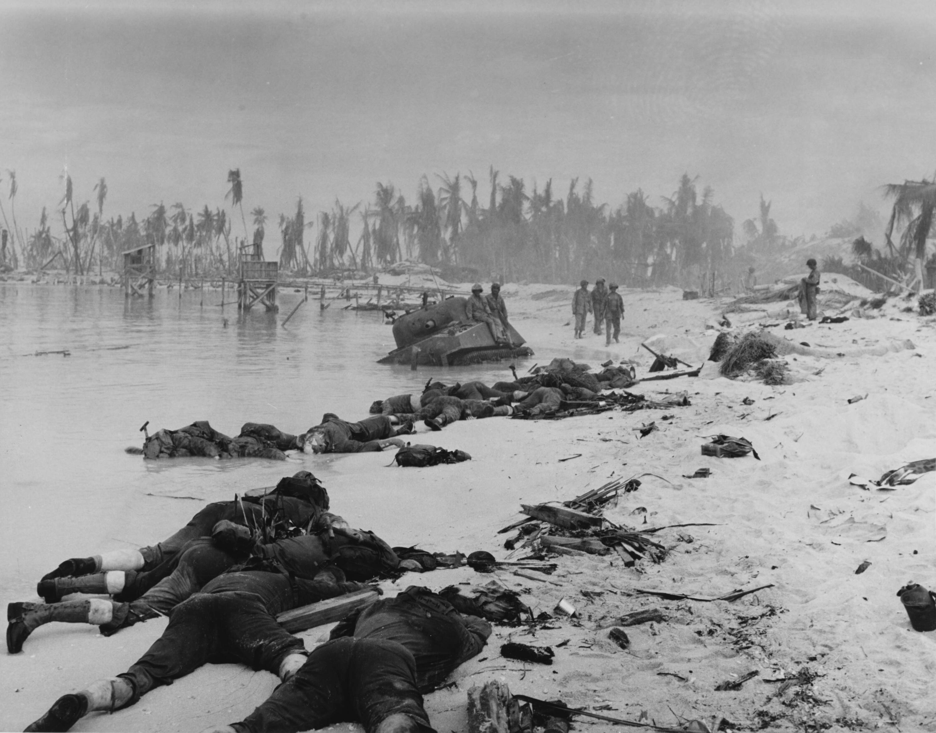 Bodies of dead US Marines, sprawled along the invasion beach on Tarawa Island near a crippled American tank.