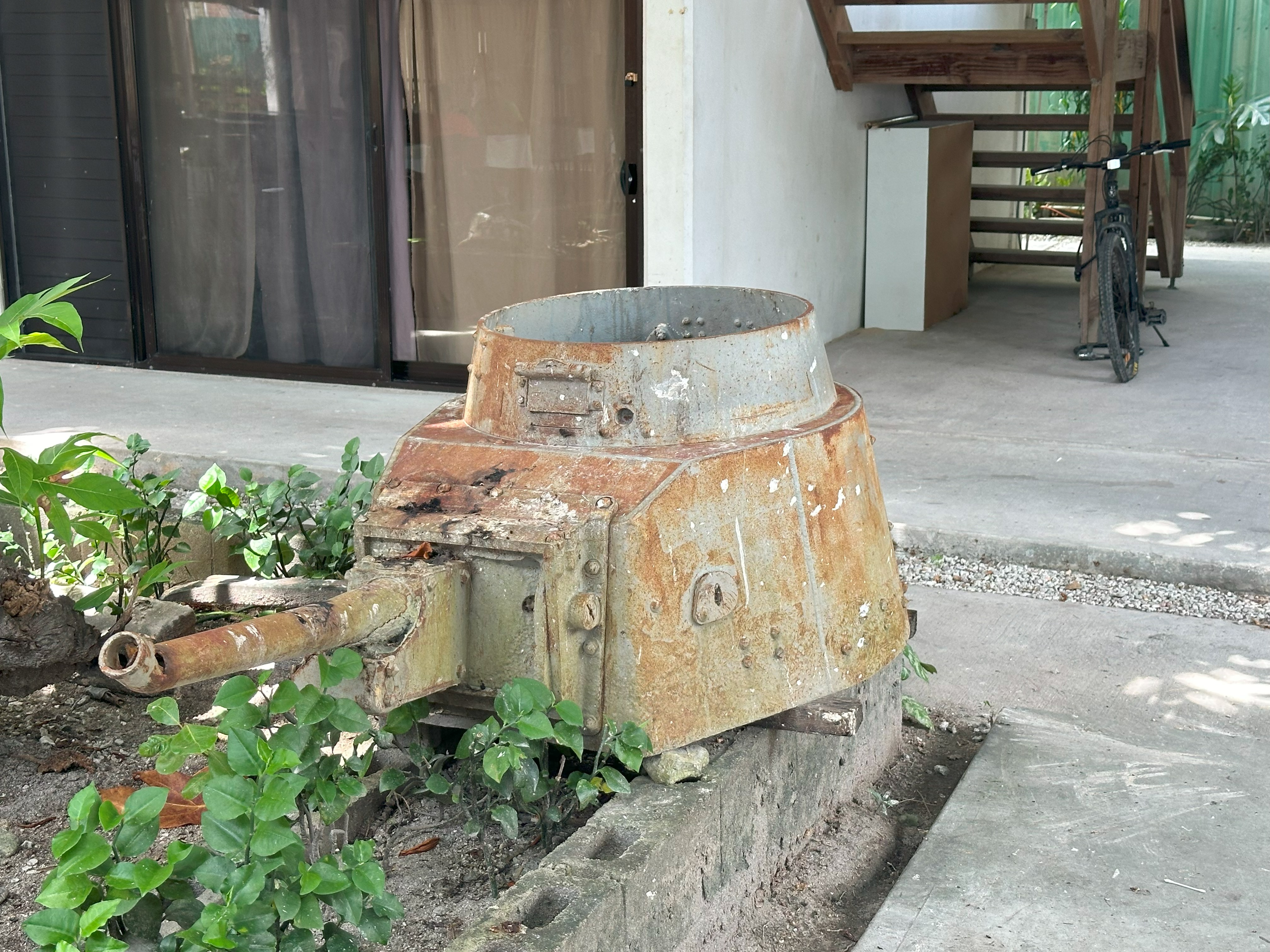 A Ha-Go tank turret in the courtyard of one of Tarawa’s few hotels, Betio Lodge. Photo credit Emily Hyles