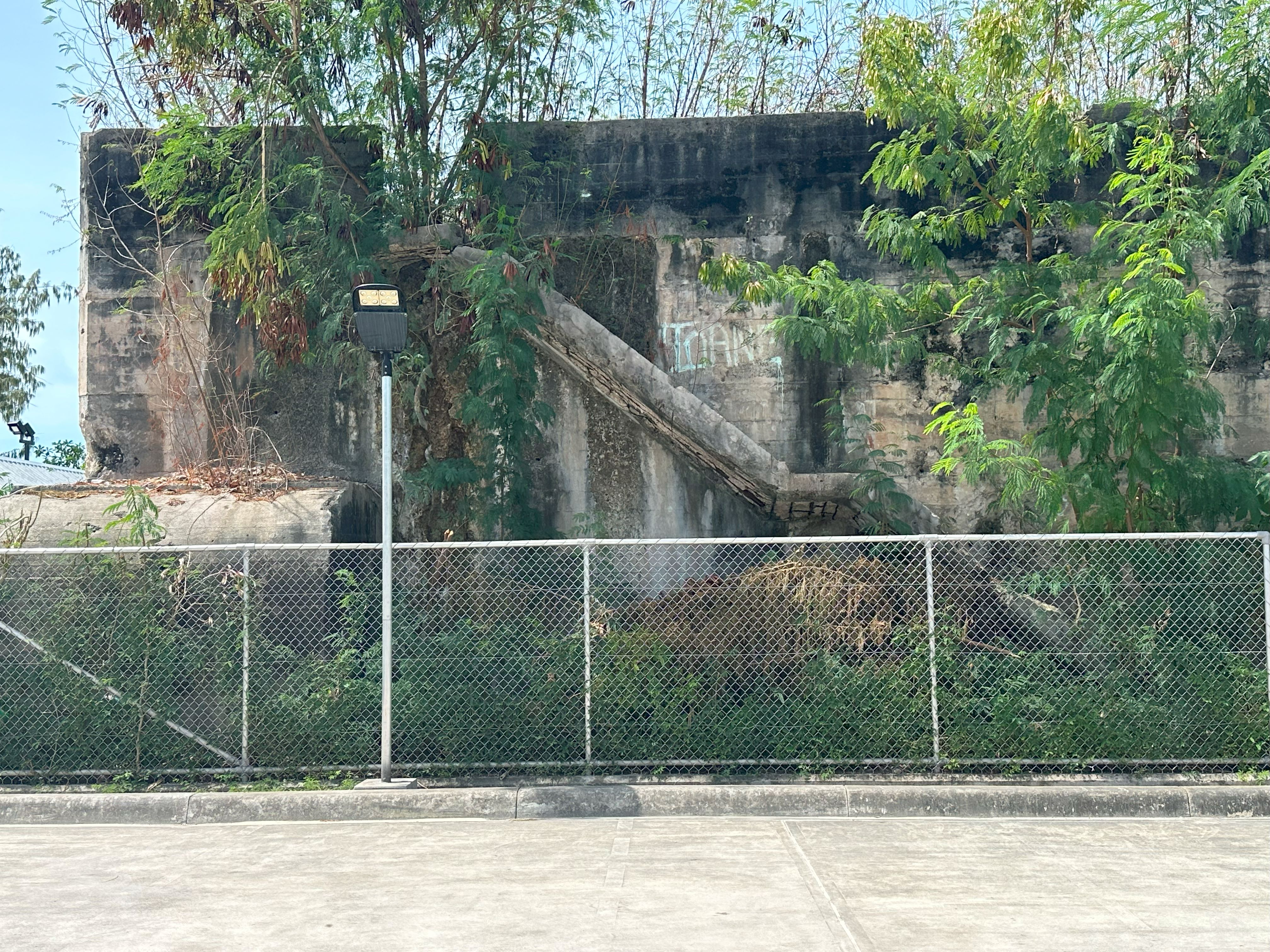 Today the structure, bordered by a basketball court and church, is where UXO (unexploded ordnance) is stored. Photo credit Michael Garside.