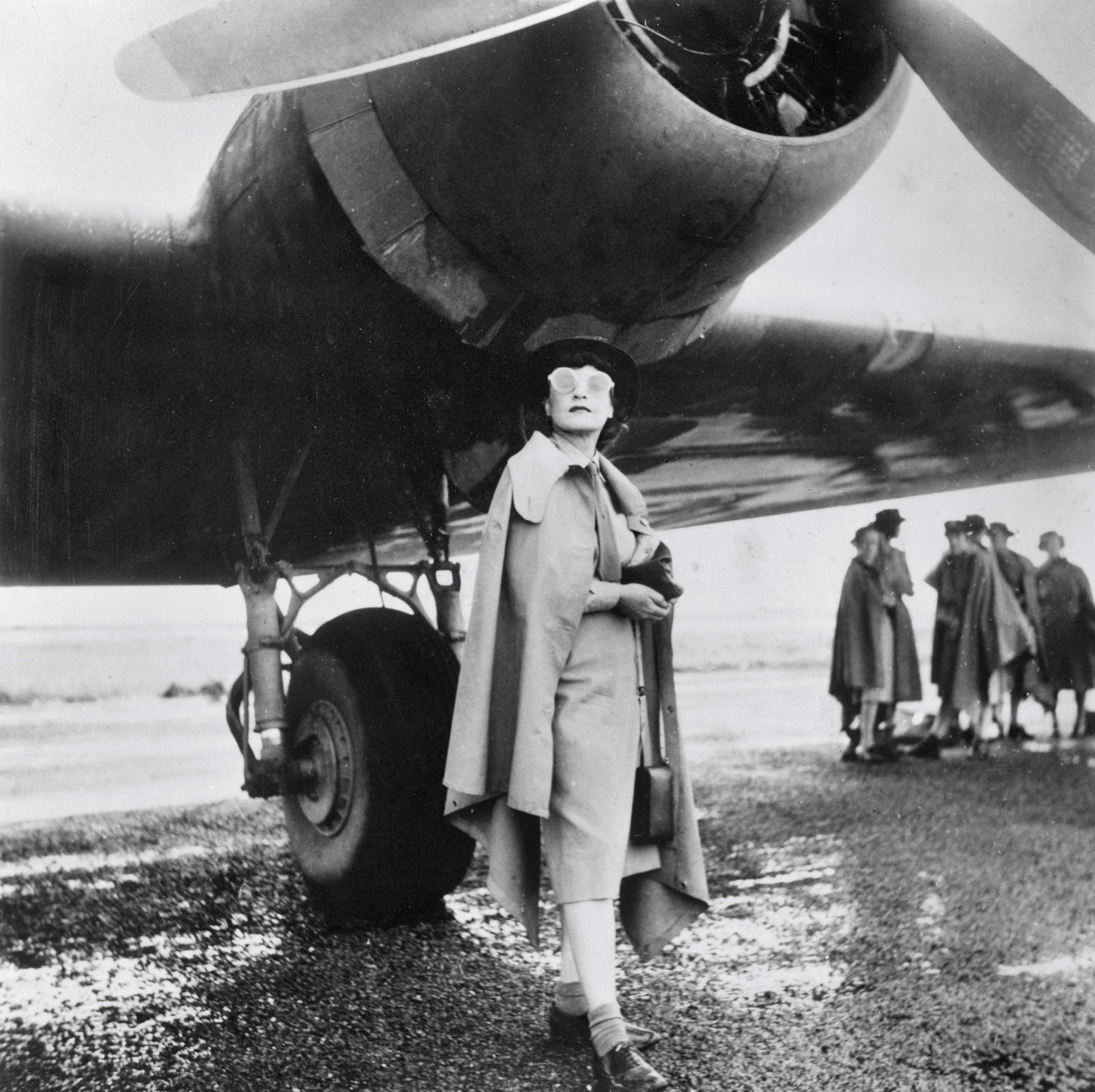 Iris Dexter standing under the starboard engine of a Doughlas C-47 aircraft. Photograph by Barbara Isaacson.