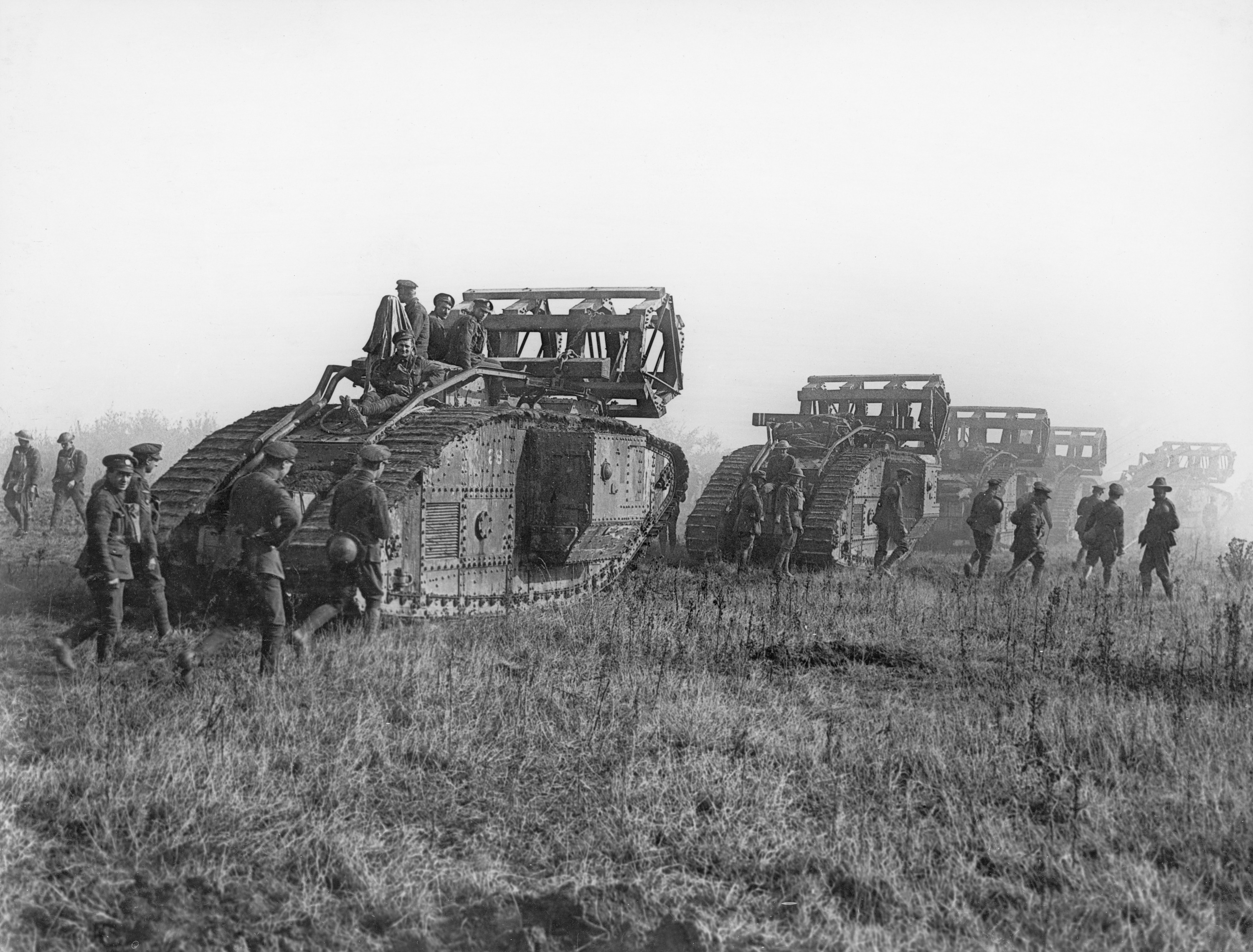 Tanks moving forward in preparation for an attack against the Hindenburg Line, 29 September 1918.