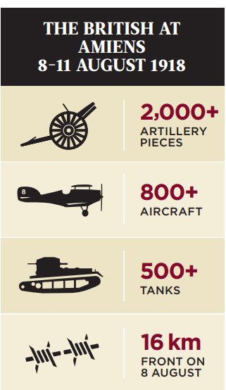 Amiens was war on a massive scale, making the most of the opportunity to seize the initiative from the Germans. Divisions of infantry – tens of thousands of men – leapfrogged through each other to take a staggered series of objectives. More than 2,000 artillery pieces, 800 aircraft and 500 tanks – every tank available to the British – were amassed to ensure the best chance of success. The initial attack on 8 August was launched by four corps across a front of ten miles (16 kilometres). As much weaponry as the British could spare would be used in those ten miles.