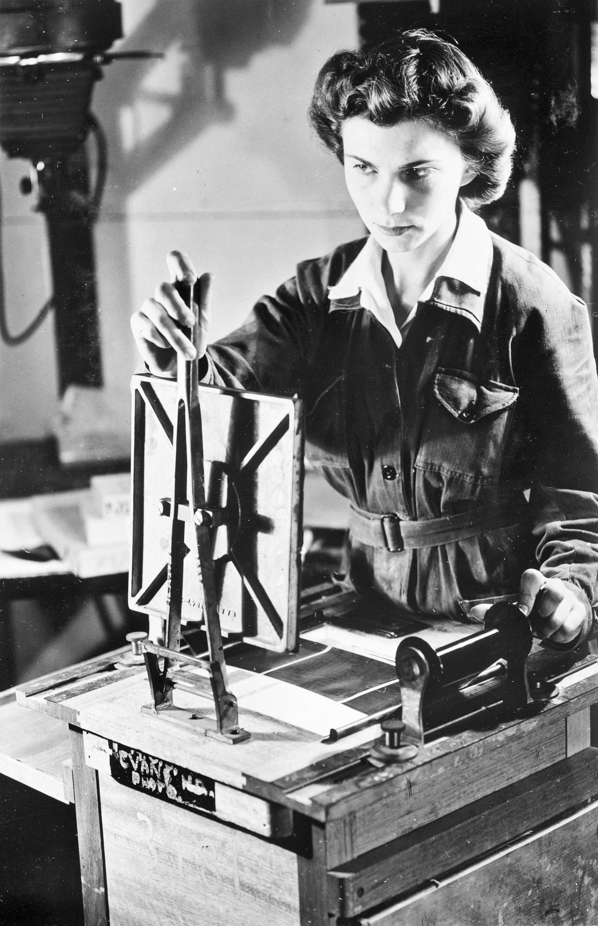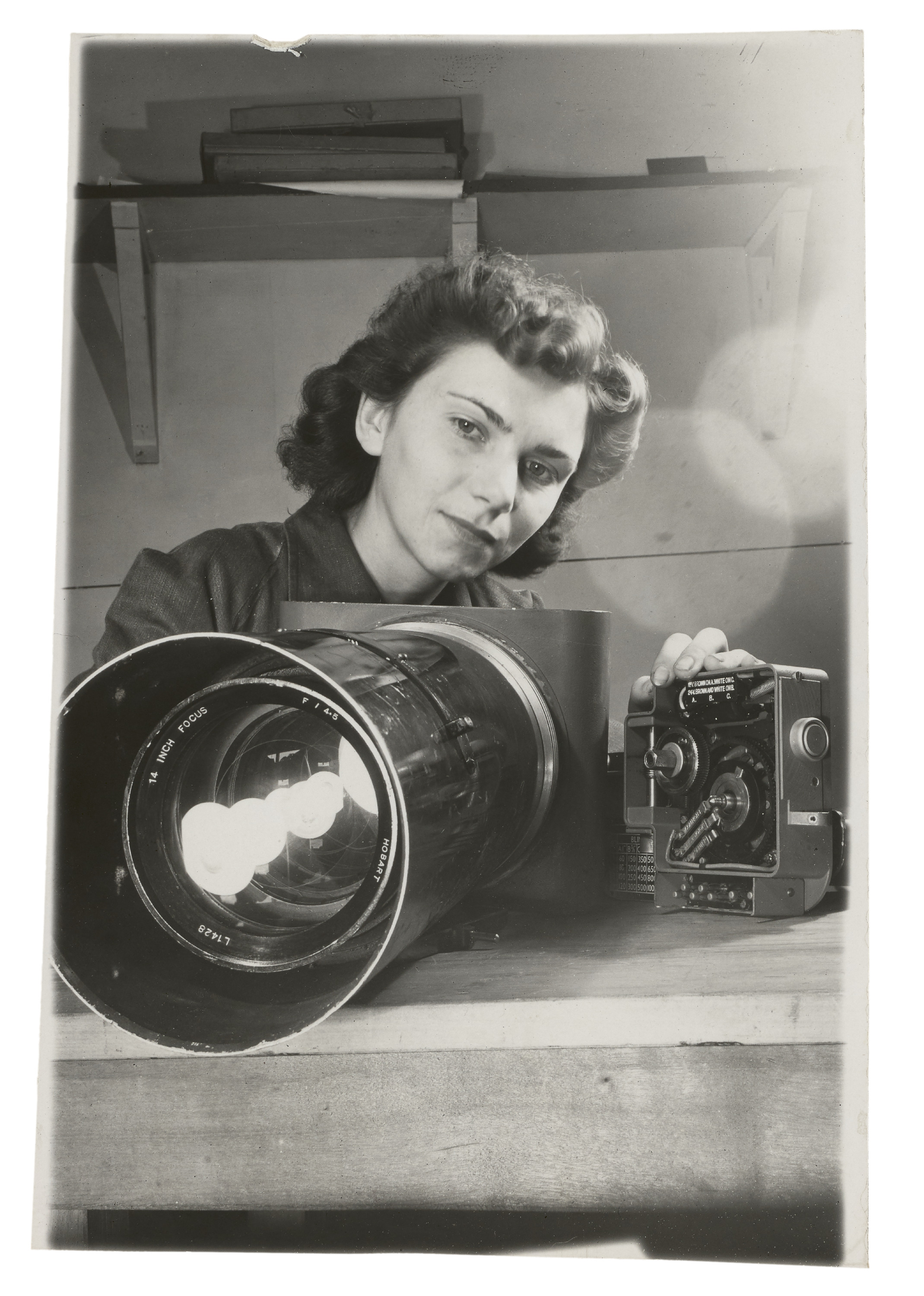 A WAAAF photographer checking an aerial camera prior to final assembly at Central Photographic Establishment RAAF Station Laverton