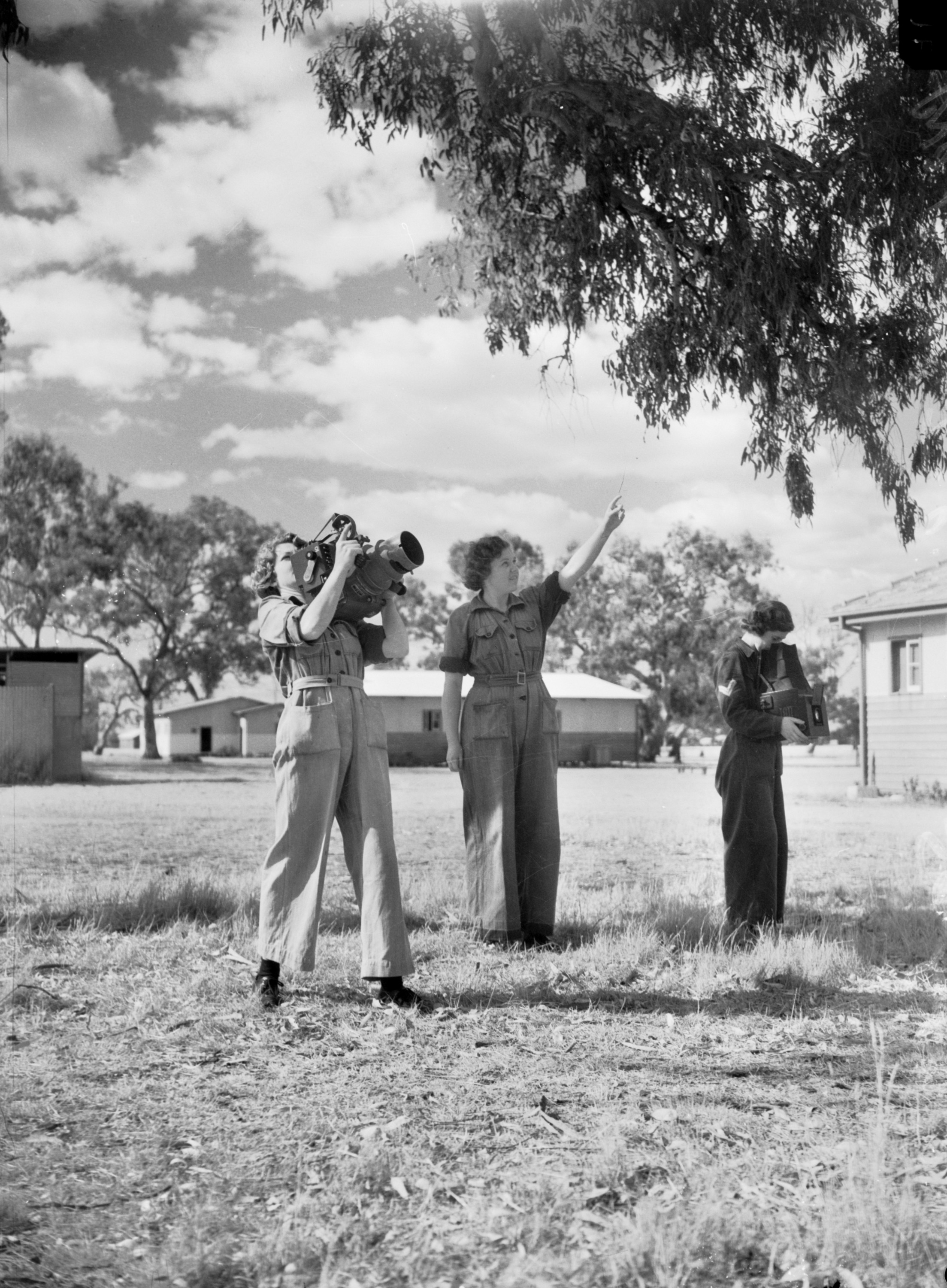 Two unidentified Women's Australian Auxiliary Air Force (WAAAF) photographers operate a motion picture (movie) camera.