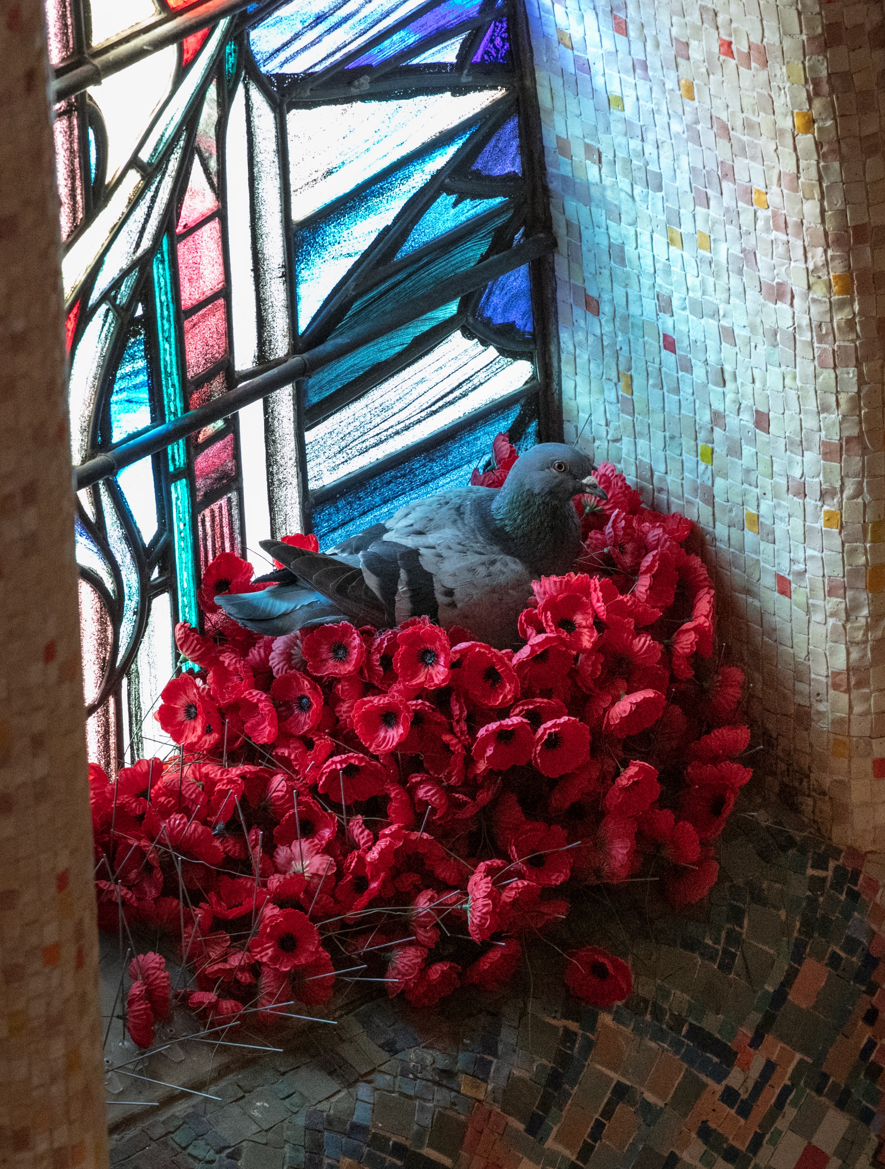 Each day the pigeon has been flying down to the Tomb of the Unknown Australian Soldier to steal poppies, carefully crafting a nest in the lead-up to Remembrance Day in an alcove above the stained-glass window of a wounded Australian soldier.