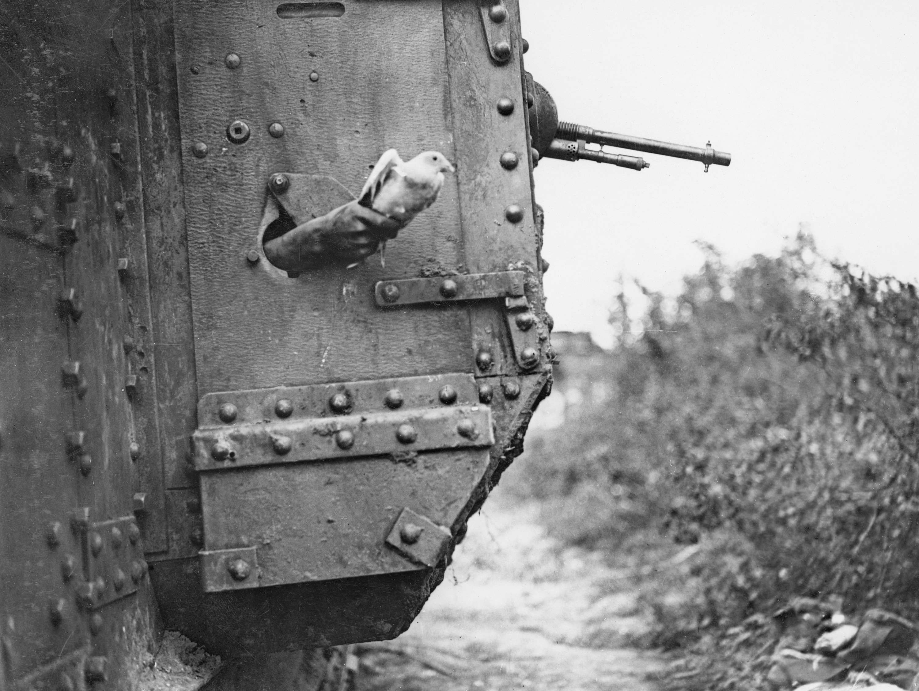 France. c. 1918. A carrier pigeon being released from a British Army tank gun turret to carry information back to the pigeon base to be subsequently passed on to army troops. (Donor British Official Photograph L1064)