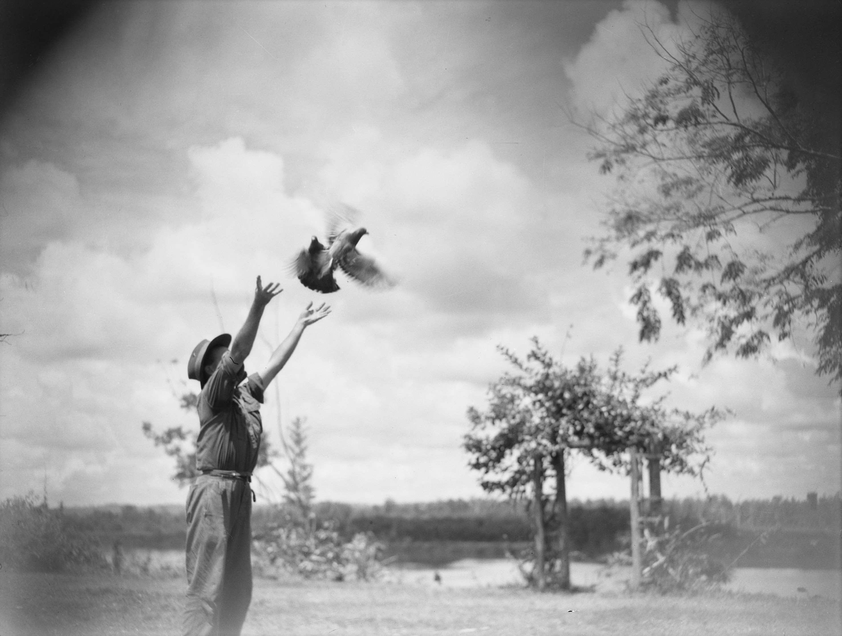 Boiken, New Guinea. 1945-07-15. A second carrier pigeon carrying a message that sick patients of 2/6 Cavalry (Commando) Regiment are being brought to cape Wom by launch is released by a member of the launch crew in case the first carrier pigeon released falls a victim to hawks. When the message reaches Headquarters 6 Division an ambulance is sent to meet the launch.