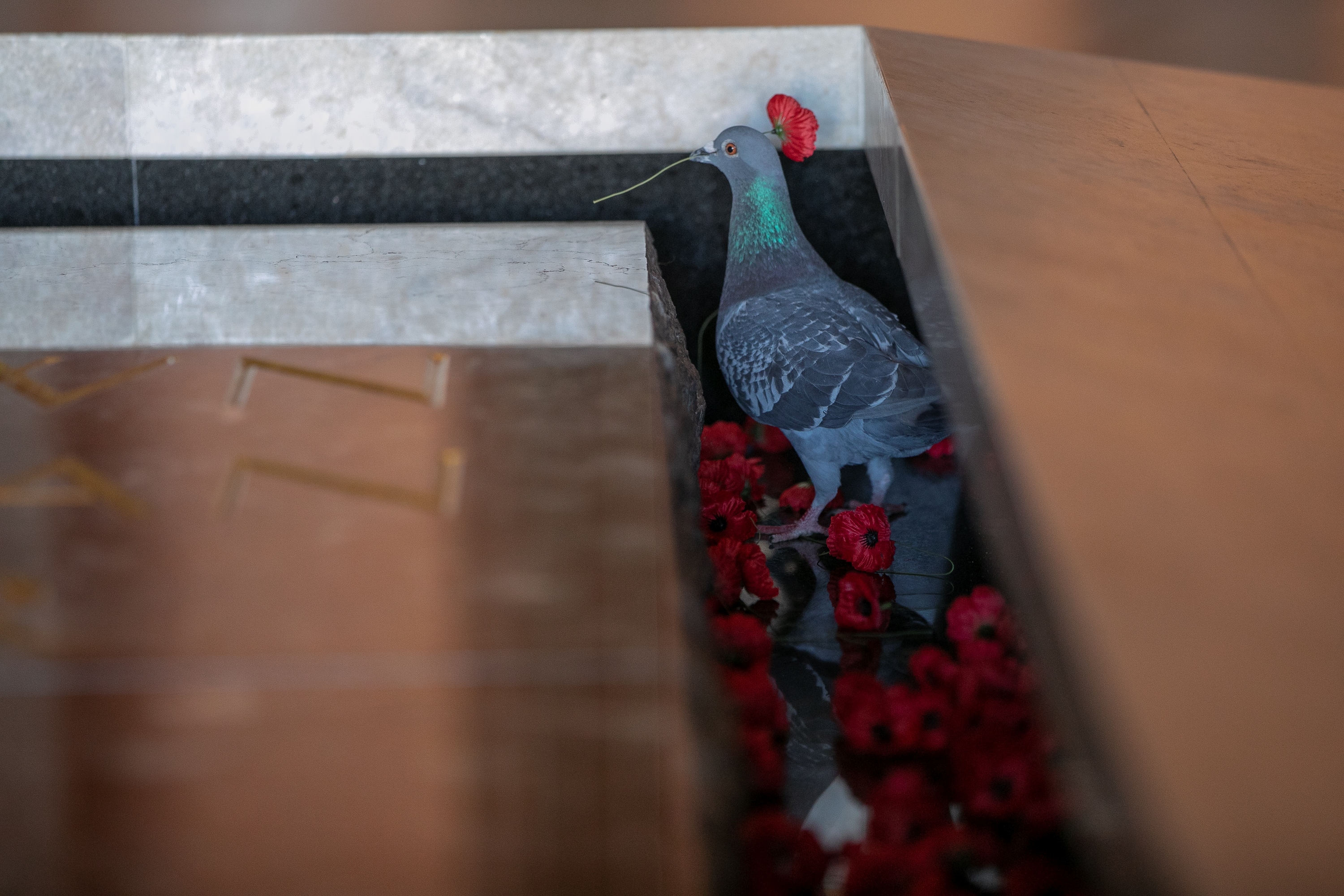 Pigeon collecting a red poppy from the Tomb of the Unknown solder, within the Hall of Memory at the Australian War Memorial. AWM2019.4.218.8